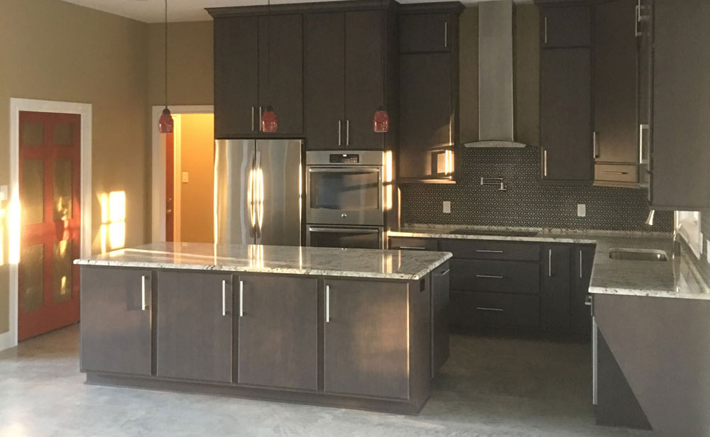 And the picture immediately above this section shows a similar style, with upgraded trim on the cabinets and high-quality granite countertops. An eclectic tile backsplash comes to life against the cabinets, giving this space a highly-contemporary feel.