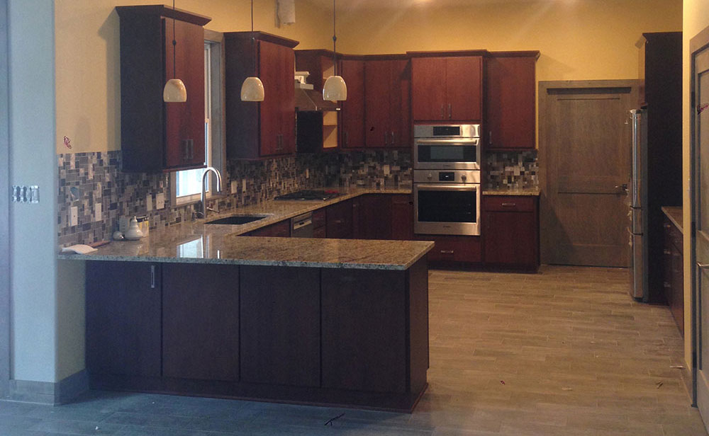 In the pictures that follow, you will find a few different styles of kitchen remodeling projects. The first one is of a complete kitchen remodel in a rustic style. The cabinets, custom built from knotty alder wood, lend the space its cozy, cabin-like feel.
